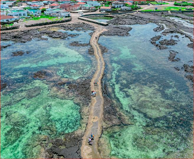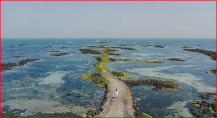 바다를 가로지르듯 뻗은 바닷길의 초록 이끼 카펫