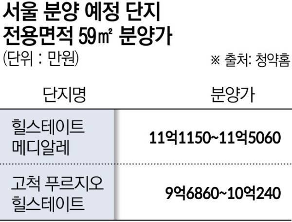 힐스테이트 메디알레와 청약 일정이 같은 구로구 고척동 '고척 푸르지오 힐스테이트'도 마찬가지다. 고척 푸르지오 힐스테이트의 분양가는 전용 59㎡ 9억6860만~10억240만 원, 전용 84㎡ 12억320만~12억4060만 원이다. 주변에 있는 '벽산베스트블루밍' 전용 84㎡는 올해 7억8000만~8억5000만 원에 실거래됐다. '경남2' 59㎡는 5억 원 미만에 팔렸다.