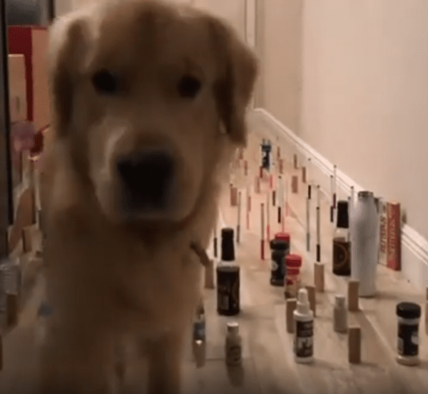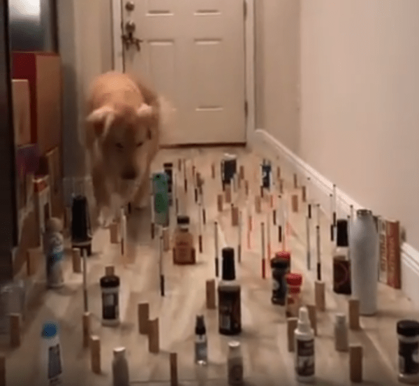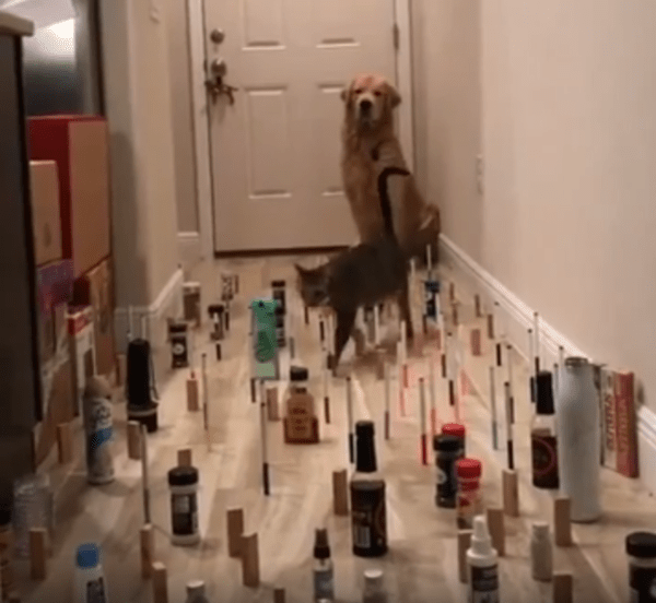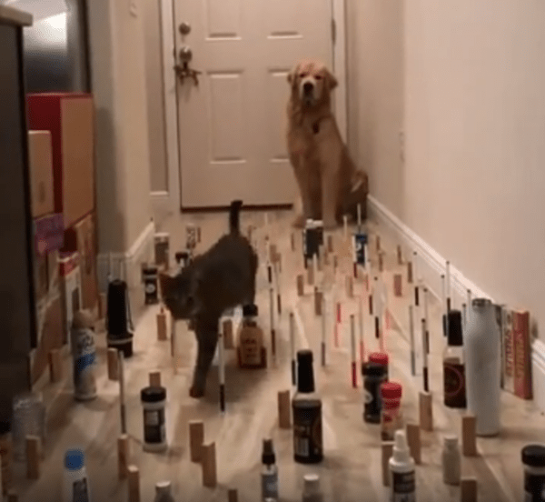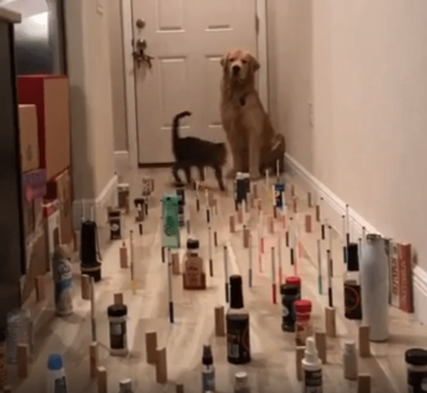 집 안 복도, 그 좁은 공간 한편에 작은 물병들과 길쭉한 물건들이 빽빽하게 세워져 있습니다. 일렬로 가지런히 정돈된 것도 아니고, 복도 한 영역 전체를 불규칙하게 채우고 있어 발을 어디에 디뎌야 할지조차 아찔합니다. 조심하지 않으면 금방이라도 연쇄적으로 와르르 쓰러질 것만 같은 위태로움. 그런데 이 복도가 오늘, 두 동물의 놀라운 집중력을 보여주는 무대가 되었습니다.
