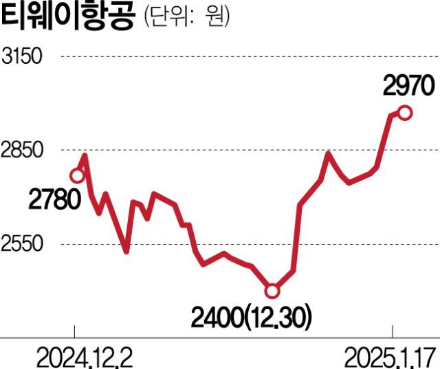 최근 대명소노그룹은 실질적인 티웨이항공 경영권 확보를 위한 태스크포스(TF)팀을 만들고 올 3월 정기주총에서 이사회 진입을 노리겠다고 밝혔다. 이에 지난해 말까지 점진적 하락세를 보였던 주가도 연초 이후 다시 불이 붙는 모양새다.