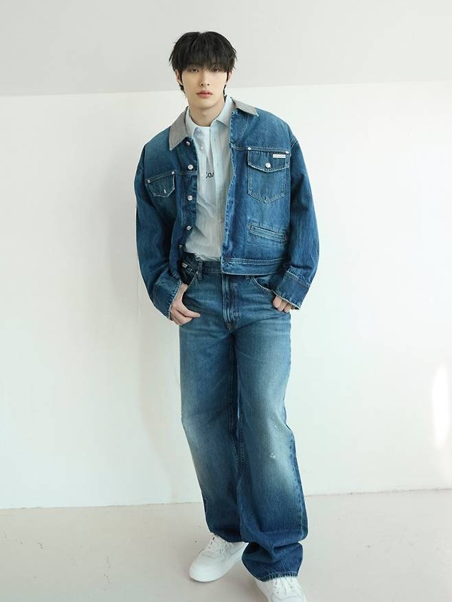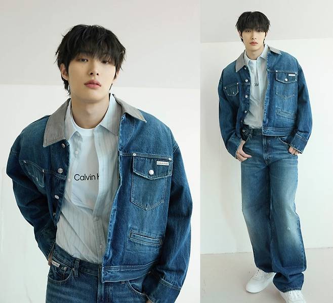 민기는 캘빈클라인과 함께한 2025 스프링 캠페인 화보에서 다크블루 데님 자켓과 배기핏 다크블루 워시 데님을 매치한 청청 패션을 완벽 소화하며 스타일리시한 매력을 발산했다.