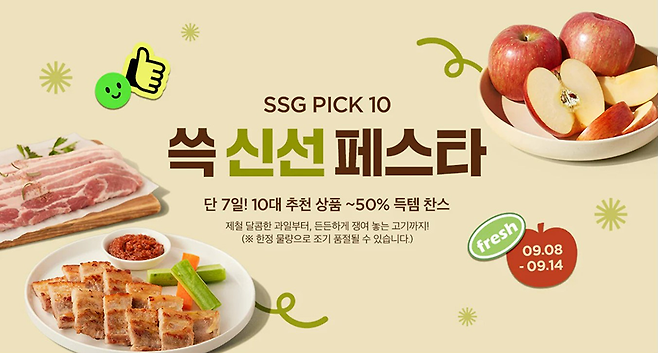 SSG닷컴은 '쓱 신선 페스타’를 오는 14일까지 열고 축수산, 과일, 채소 등 이마트 인기 신선식품을 최대 50% 할인해 판매한다고 10일 밝혔다.