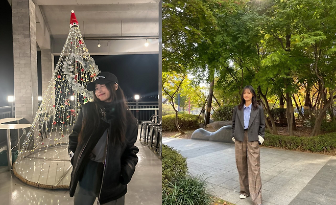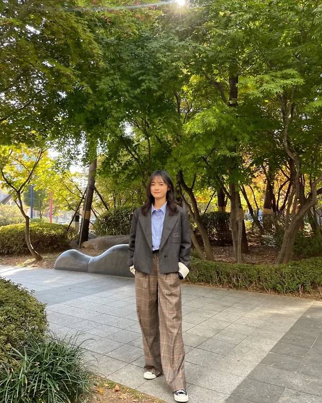 체크 패턴 팬츠와 오버사이즈 블레이저를 매치해 클래식하면서도 감각적인 가을 패션을 선보였다. 블루 셔츠와 브라운 톤 팬츠의 조합은 차분하면서도 세련된 느낌을 주며, 자연광과 어우러져 따뜻한 계절감을 강조한다. 전체적으로 포멀하면서도 편안함을 잃지 않은 스타일링이 돋보인다.