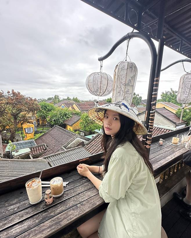 고보결은 베트남 전통 모자인 논라와 루즈핏 화이트 셔츠를 착용해 여행지의 여유로운 분위기를 담아냈다. 가벼운 소재의 셔츠는 편안함을 주며, 자연스러운 스타일링으로 여행지의 감성을 살렸다. 여기에 간단한 음료와 함께한 연출이 한층 더 따뜻하고 소박한 이미지를 완성한다.