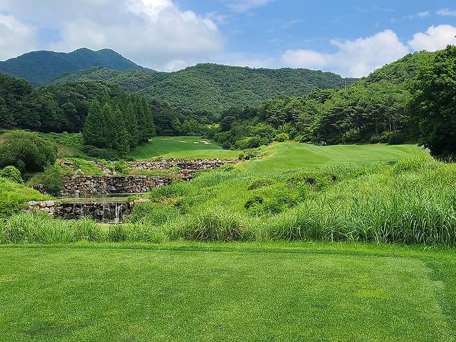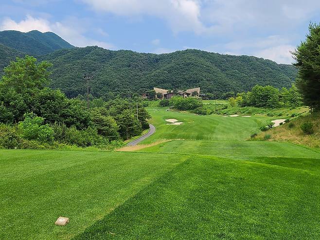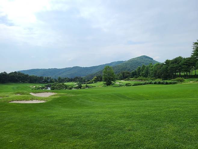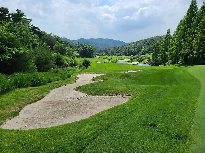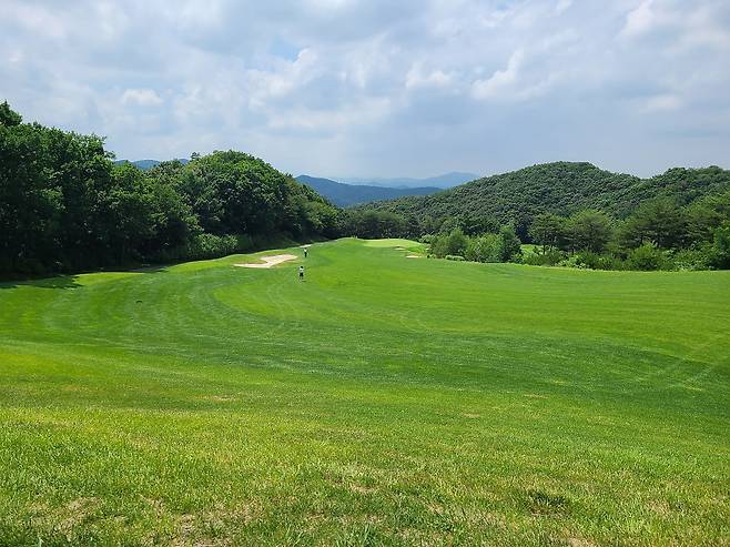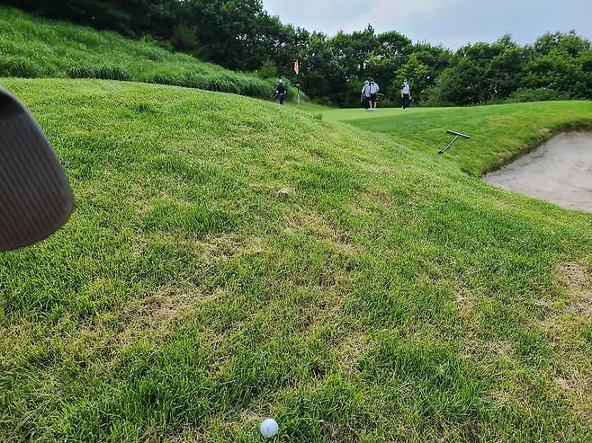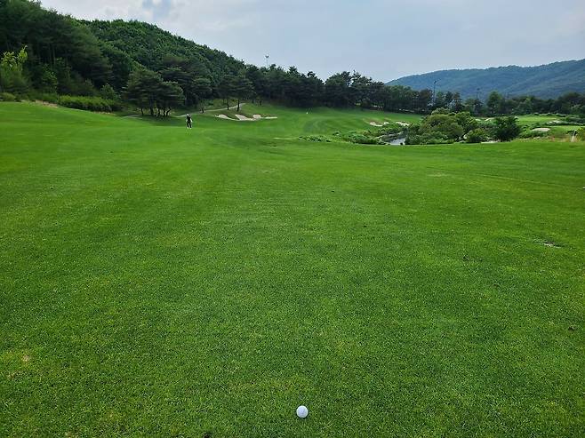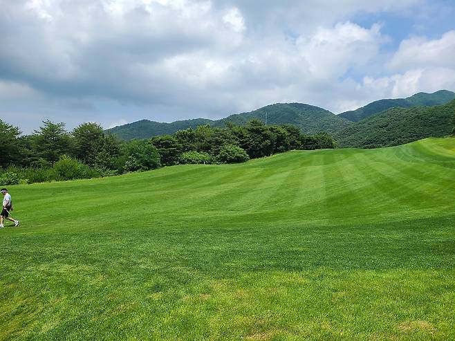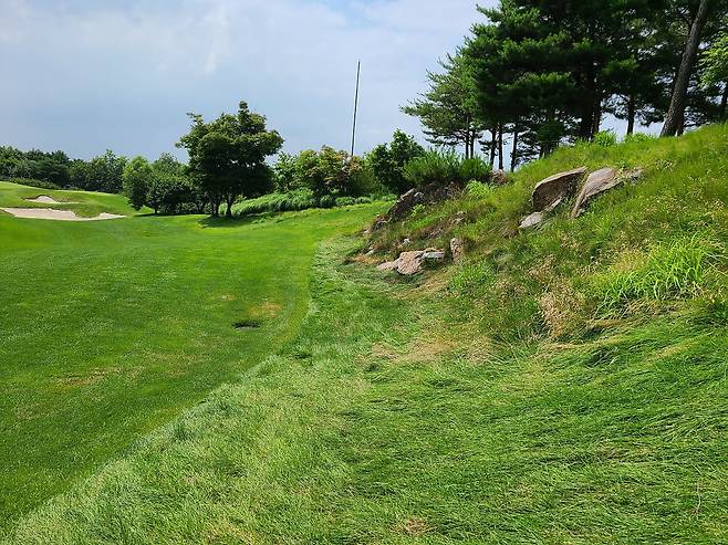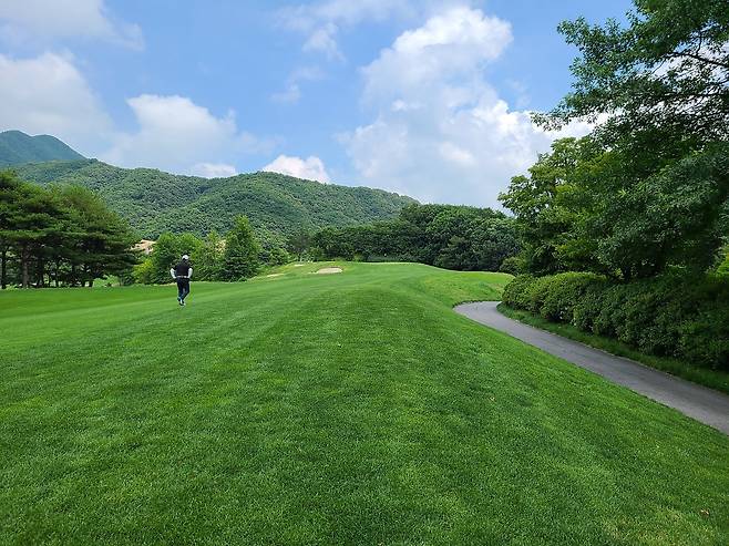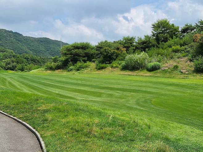 "한지형 양잔디인 양질의 켄터키 블루그래스로 식재된 페어웨이"입니다. 일반적인 장마철 관리에 따라 페어웨이 잔디가 약간 길게 자라있습니다. 양잔디라서 디봇은 떠지지만 잔디 아래 땅이 약간 단단한 찰흙이라서 힘이 들어가야 합니다. 코스 내내 피로감이 쌓이는 원인이 거친 오르막/내리막뿐만이 아니라는 거지요.