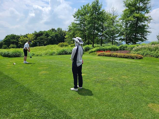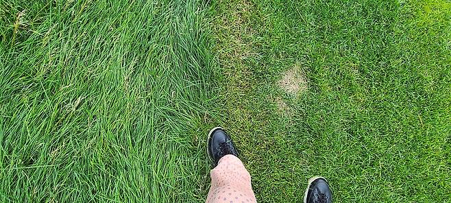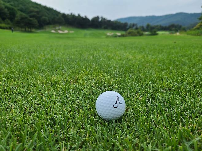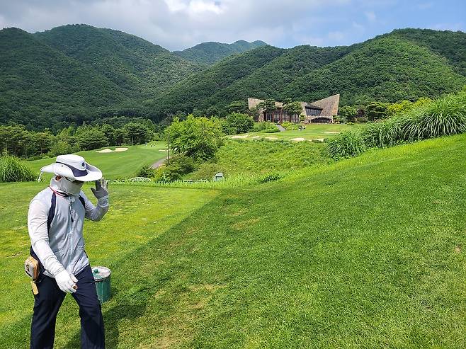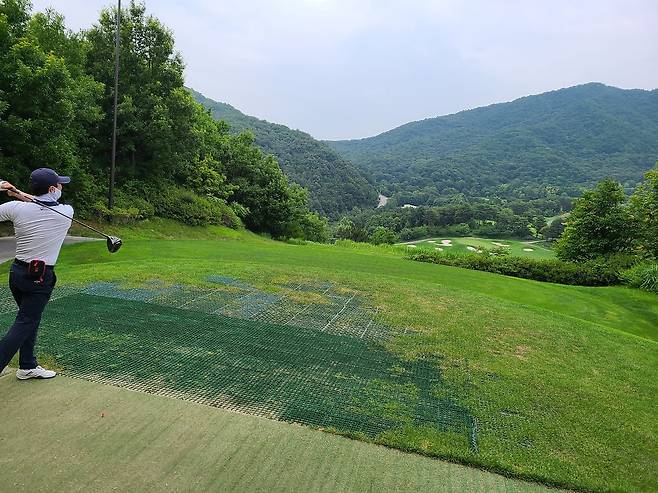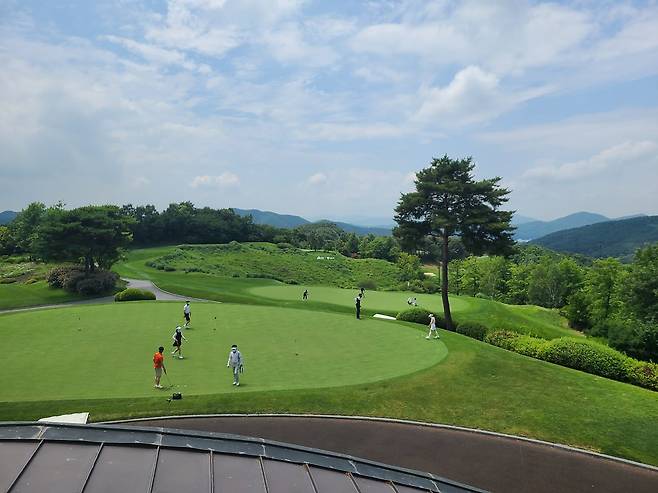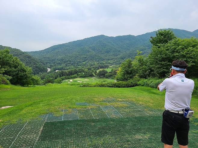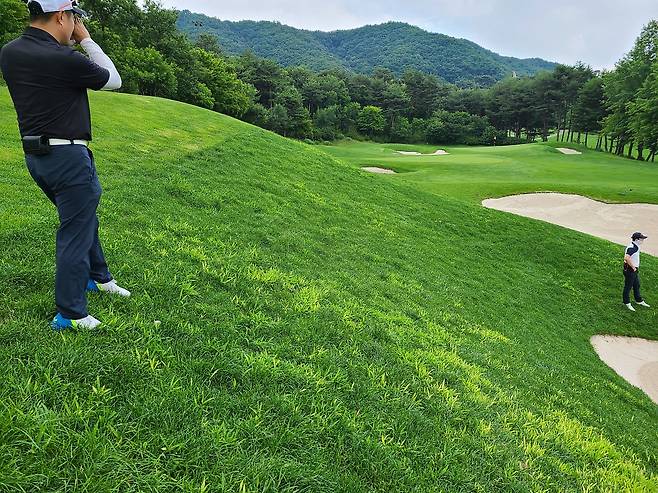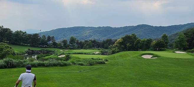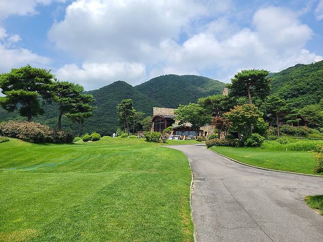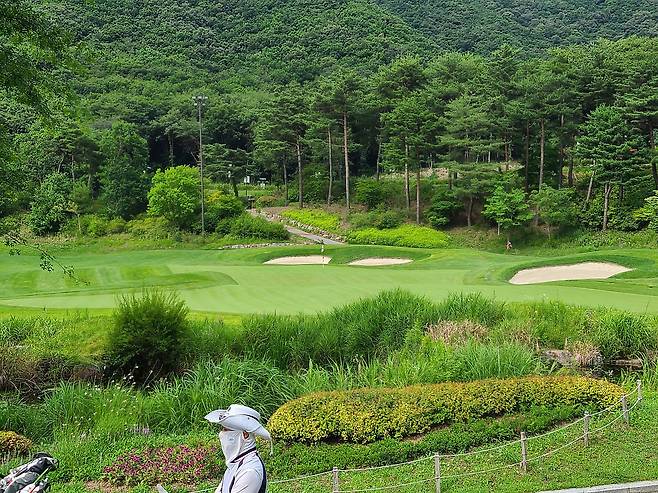 "한지형 양잔디인 양질의 켄터키 블루그래스로 식재된 페어웨이"입니다. 일반적인 장마철 관리에 따라 페어웨이 잔디가 약간 길게 자라있습니다. 양잔디라서 디봇은 떠지지만 잔디 아래 땅이 약간 단단한 찰흙이라서 힘이 들어가야 합니다. 코스 내내 피로감이 쌓이는 원인이 거친 오르막/내리막뿐만이 아니라는 거지요.