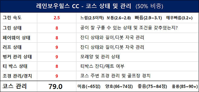 새삼 느꼈는데 레인보우힐스에도 은근 벙커들이 많더군요. 여기 관리팀이 상당히 신경을 잘 쓴 것 같습니다. 모래는 고운 편에 양도 충분하며, 벙커 주변에도 무성한 러프로 방어를 하고 있습니다. 벙커 엣지 주변을 관찰하는 습관이 있는데 벙커 벽과 주변이 무너져있는 곳이 거의 없고 잡초나 지저분해 보이는 잔디가 잘 정리되었음을 볼 수 있었습니다.