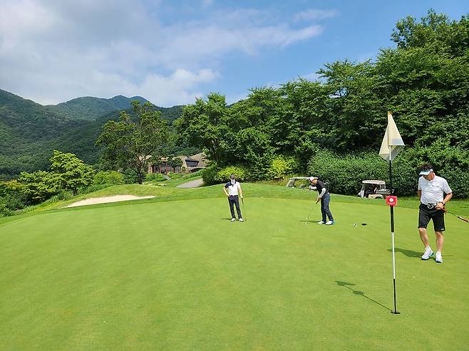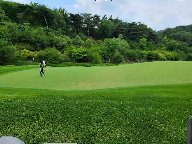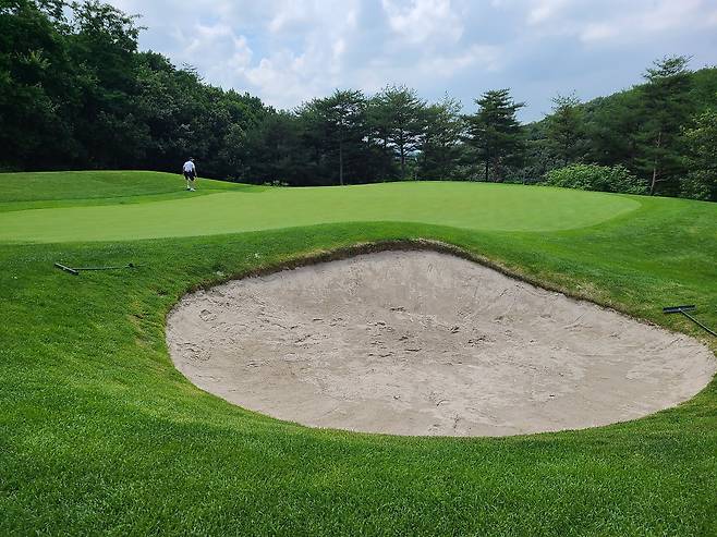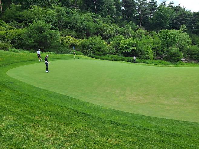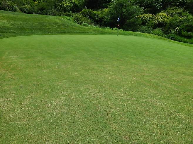 그린 표면에 에어레이션과 샌딩 작업을 약 1주일 전에 해놓은 상태라고 해서 최상 상태가 아니었으나 퍼팅하기에는 큰 지장이 없습니다. 아주 가끔 그린 부분들이 색상이 변한 곳도 보였지만 대체로 양호한 상태입니다. 장마로 많은 비가 내렸어도 이 정도 관리라면 훌륭하다고 생각합니다.