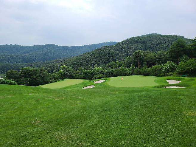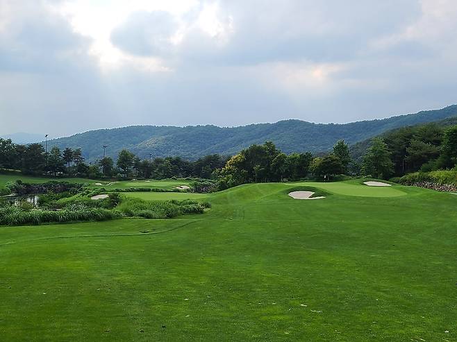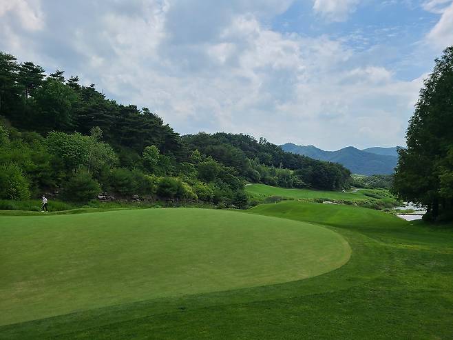 그린은 중/대 사이즈이며 라이가 큼직큼직하게 층으로 나뉘는 시각적으로 매우 위협적인 그린입니다. 2.6미터 속도라면 크게 어렵지 않지만 2.8미터 이상에 가지 말아야 할 곳에 가있다면 거의 떡실신입니다. 특히, 대회 코스인 남코스 그린은 오르막 블라인드 그린이 자주 있고 그린 주변의 벙커를 피해야겠다는 생각에 자칫 빠지거나 진짜 어려운 위치로 갈 수 있습니다. 결과는 핀에 절대 붙이지 못하는 라이이며, 그린에 올려도 쓰리펏이 쉽게 나올 수 있습니다.