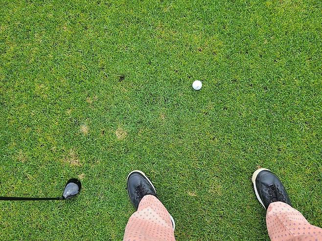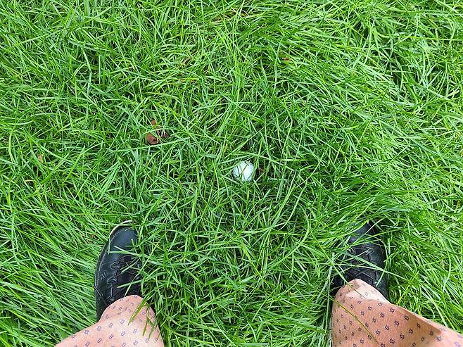이날 러프는 1st, 2nd 컷, 그리고 귀신풀로 구성된 초보 골퍼들의 지옥이었습니다. 밀림을 방불케하는 무성한 러프는 잘 관리된 카오스(?) 티 박스에 서면 어떻게든 러프를 피할 생각에 티 샷이 에러 나기 일쑤이며, 어김없이 러프에 들어간다면 본전을 찾기 힘드게 세팅된듯합니다. 위 사진은 2차 컷 러프인데 운 좋게 공이 잔디 위에 올라서 있네요. 보통, 잔디 사이로 가라앉아 있는 경우가 허다했습니다.