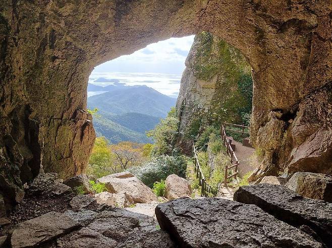 쌍홍문은 금산 38경 중 으뜸으로 꼽히는 명소입니다. 바위로 뚫린 두 개의 자연 석문을 지나면 기운이 맑아지는 통로를 지나는 듯한 독특한 체험을 할 수 있습니다. 이후 보리암을 지나 목재데크로 이어진 길을 따라 오르면 드디어 연대봉 정상입니다.
