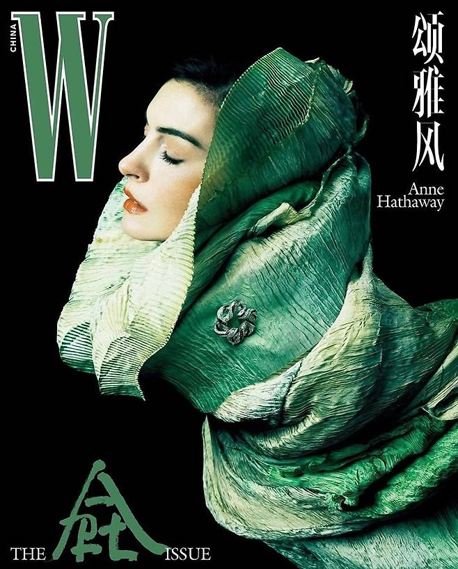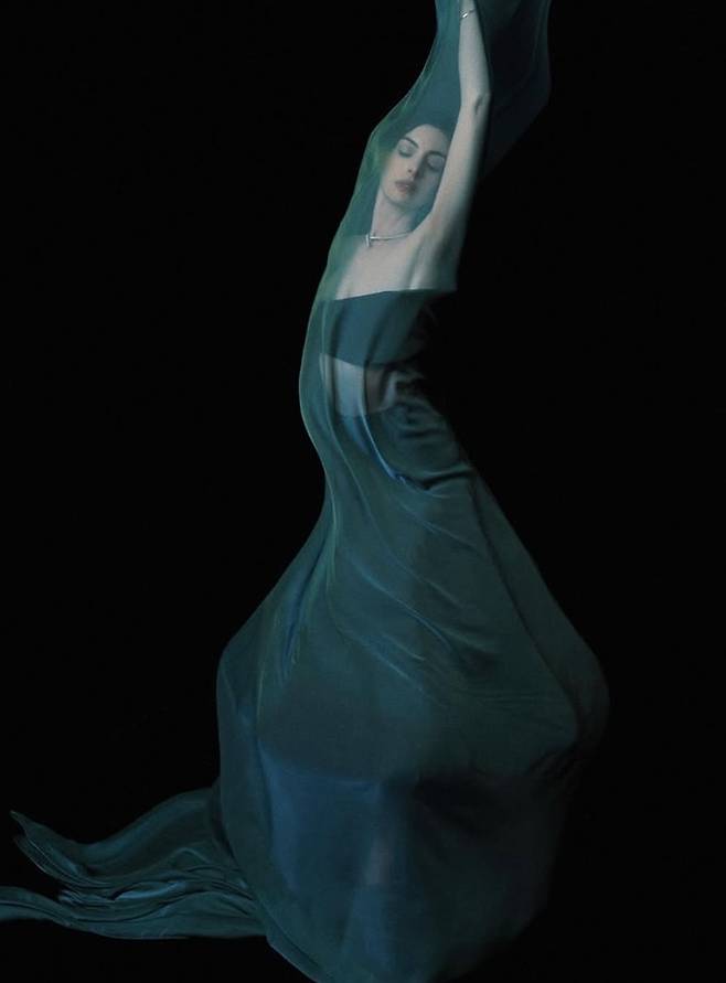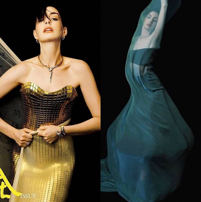 공개한 화보에서 애 해서웨이는 골드 컬러의 오프숄더 드레스와 시스루 드레스룩으로 예술 작품 같은 신비하면서도 판타스틱한 스타일을 연출했다.