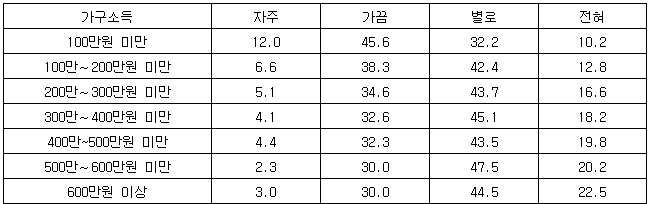 300만∼400만원 미만 가구는 55.6%, 400만∼500만원 미만은 55.8%로 비슷한 수준을 보였고, 500만∼600만 원 미만은 61.0%에 달했다.
