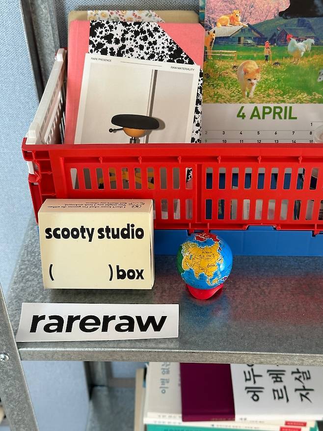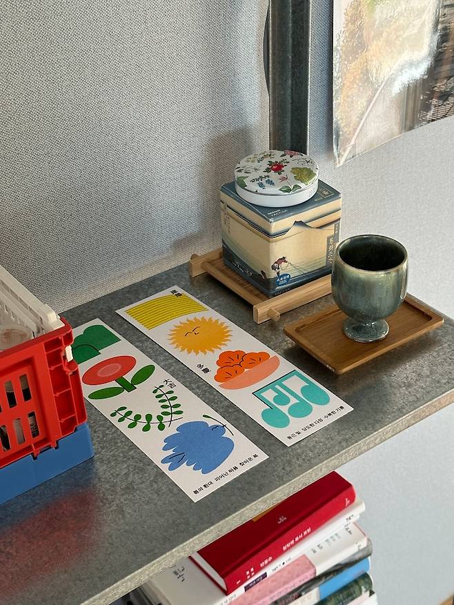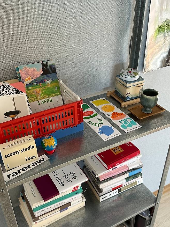 견고하진 않지만 아름답고, 가격도 무척이나 저렴해서 복층에 이미 4개가 자리 잡고 있어요. 그중 하나인 이 선반은 각종 귀여움을 담당하는 공간으로 사용하고 있어요. 선물 받은 아이템들 위주로 꾸며보았습니다. 이 집에 이사 올 때 문 앞에 걸고 싶어 주문했다가, 너무 아름답고 아까워서 전시해 둔 정혜지 디자이너의 '2023 입춘첩'을 메인으로, 귀여운 포인트들을 모아보았습니다.