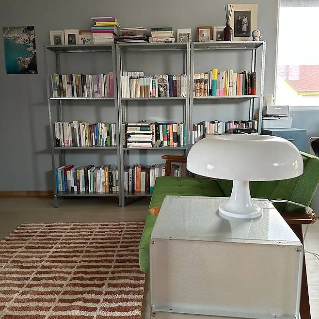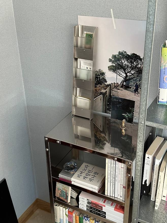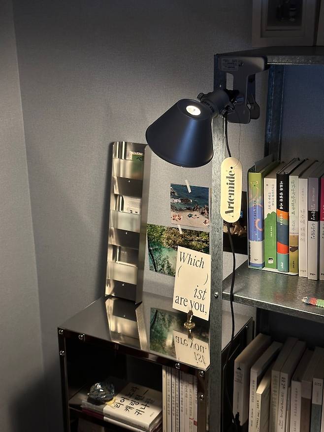 그리고 한쪽 코너가 비어있어 고민하다가, 저만의 큐레이션 서재를 꾸미고 싶다는 생각이 들었어요. 스틸의 느낌을 살릴 수 있는 가구들을 찬찬히 둘러보다 발견한 행잉 스터프의 미니 선반을 베이스로 차가운 느낌에 따스한 책을 얹어보자, 생각하고 몇 가지 가구와 소품을 주문했습니다.