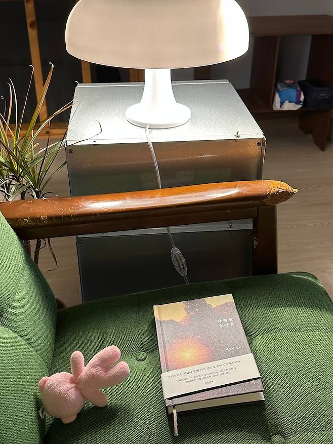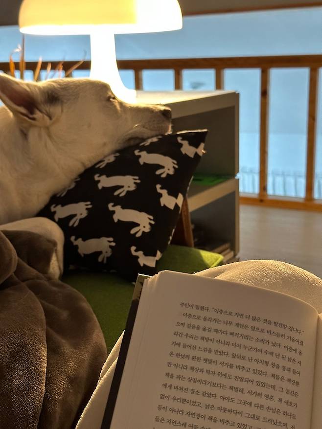 퇴근하고 체력이 괜찮을 때면, 복층에 올라가 시간을 보내고 있어요. 올라오면 같이 따라오는 구름이와 함께 구름이는 소파에서, 저는 러그 위에 엎드려 책을 읽곤 해요.