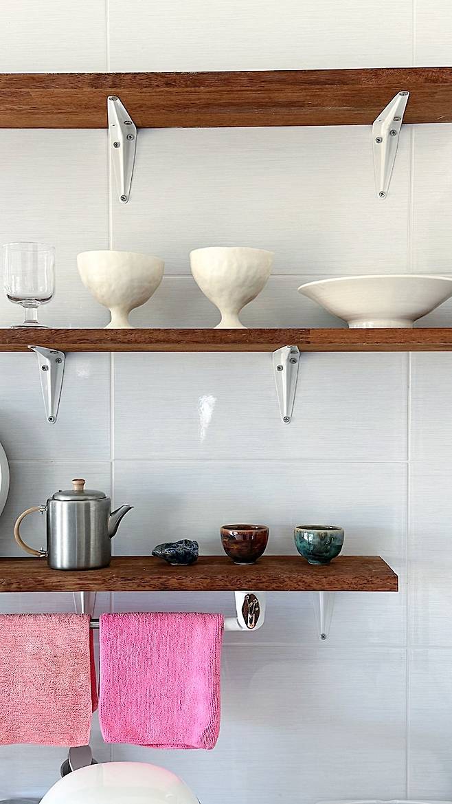 원래 설치되어 있던 나무 선반에 좋아하는 친구의 도자기 작품들을 얹어놓고 싶어 의뢰해서 만들어진, 하나 뿐인 도자기들이에요.