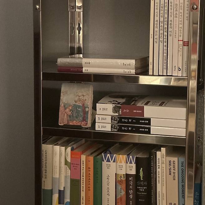 두 번째 칸에 올려둔 그림은 아씨시에서 데려온 작품인데요, 아씨시 성당 프레스코 기법과 동일하게 작업한 풍경으로 제가 사랑하는 성 프란체스코의 삶이 담겨 있어요. 여행할 당시 제주도 이사 가면 집 한쪽에 평화를 기도하는 마음으로 두려고 했는데 드디어 알맞은 자리를 찾게 되어 기뻐요.