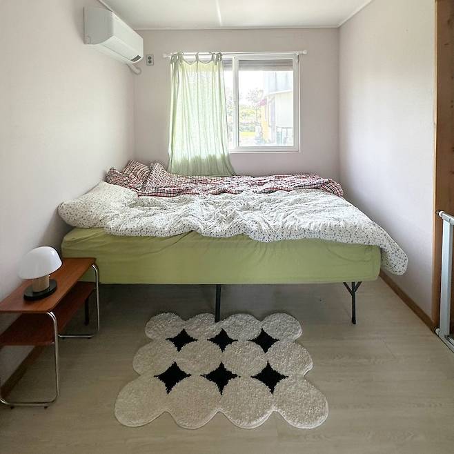 신혼집과 제주 첫 번째 집을 거칠 때까지는 마땅히 쉴 장소가 없어서 책도, 쉼도, 놀이도 모두 침실에서 이뤄지곤 했는데요, 이번 집으로 이사 오게 되면서 공간 분리가 되어 침실은 가장 심플하게 두기로 했어요. 그래서 딱 침대와 협탁, 그리고 안 보이는 맞은편에 거울 하나만 둬서 잠자는 장소로만 사용하고 있어요.