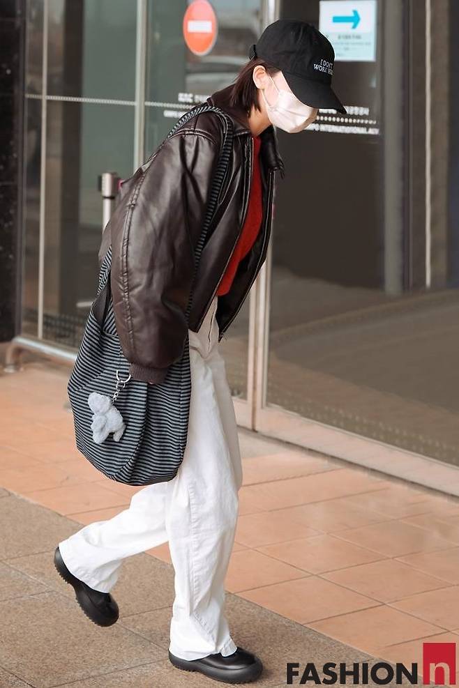 카리나는 이날 화이트 팬츠와 레더 봄버 재킷, 여기에 마스크와 볼캡을 매치한 스타일리시한 레더룩을 연출했다.