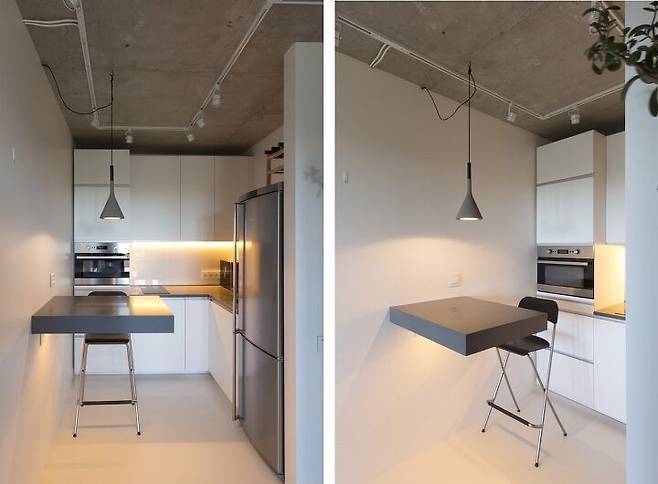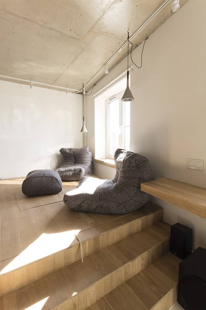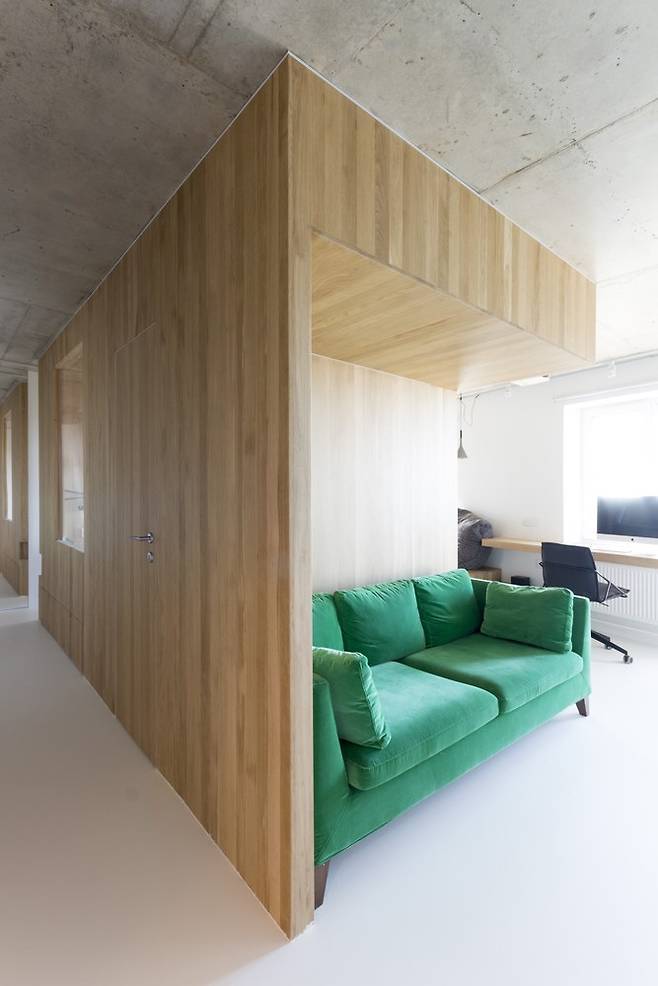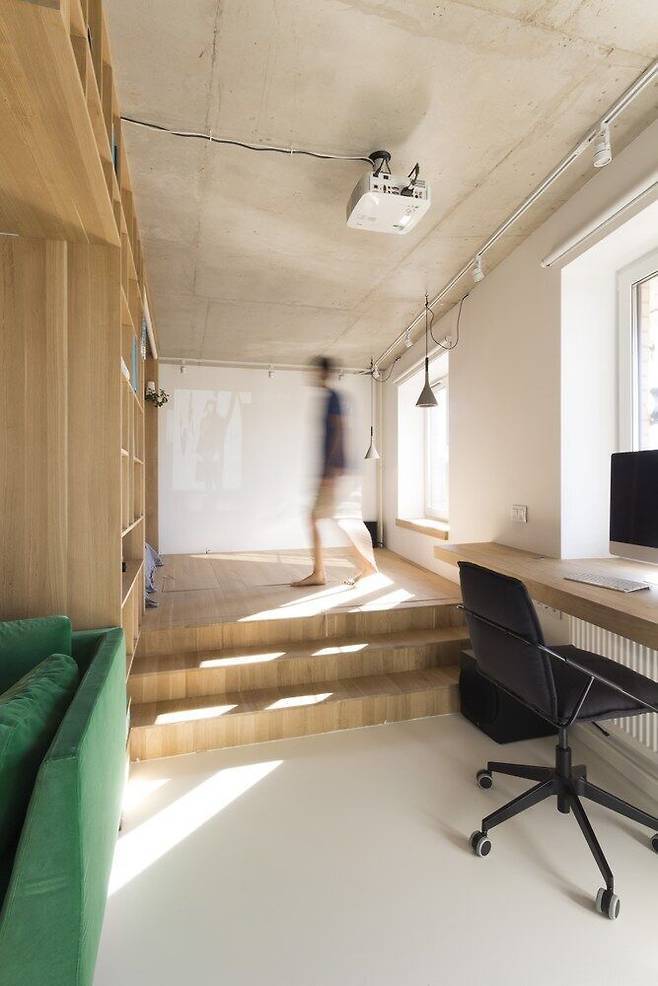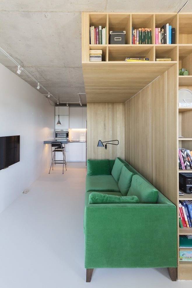 스튜디오가 많은 서양에서는 가구를 사용한 공간 나누는 방법을 쉽게 찾을 수 있다. 이 모스크바 스튜디오 아파트처럼 맞춤 가구를 제작하는 경우도 있지만 여건이 맞지 않을 때는 소파와 일반 책장을 사용해 위와 같은 효과의 공간을 만들어낸다. 이때 소파는 벽에 붙이지 않고 공간 분리가 필요한 곳에 배치해 소파 뒷면이 하나의 파티션처럼 사용한다.