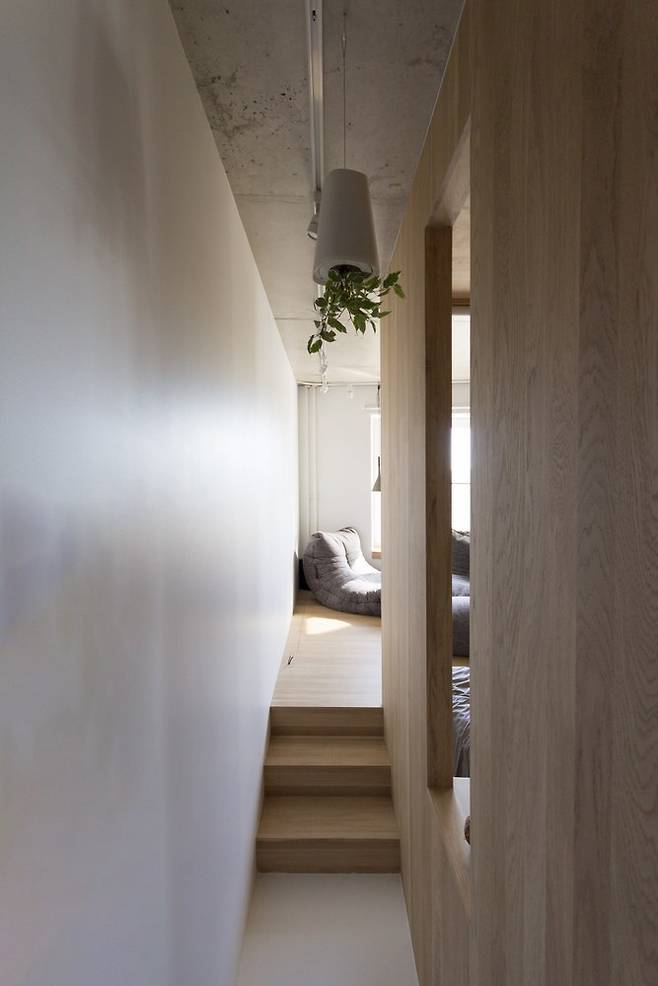벽 하나 없는 스튜디오 공간은 합판으로 만든 가구로 나누어진다. 책장과 진열장을 역할을 하는 맞춤가구는 침실 공간과 리빙 공간, 욕실 공간을 자연스럽게 나눠준다. 벽의 개념이 아닌 가구를 배치하면서 기능에 따라 공간이 나누어지는 느낌이다.