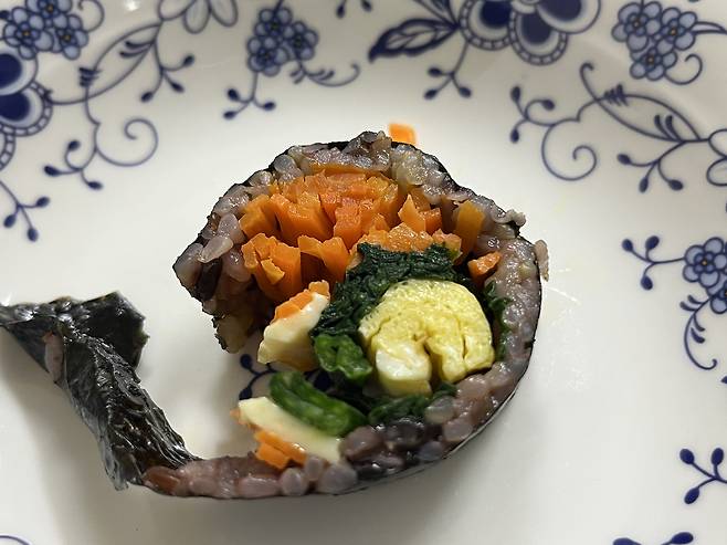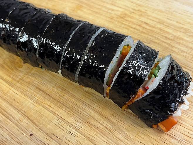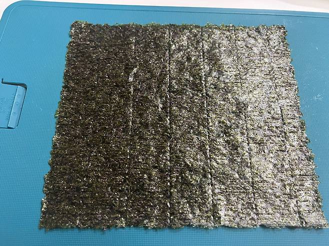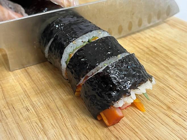 김에 참기름을 바르고 잘라보면 김밥이 터지지 않고 깔끔하게 잘리는 것을 볼 수 있습니다.
