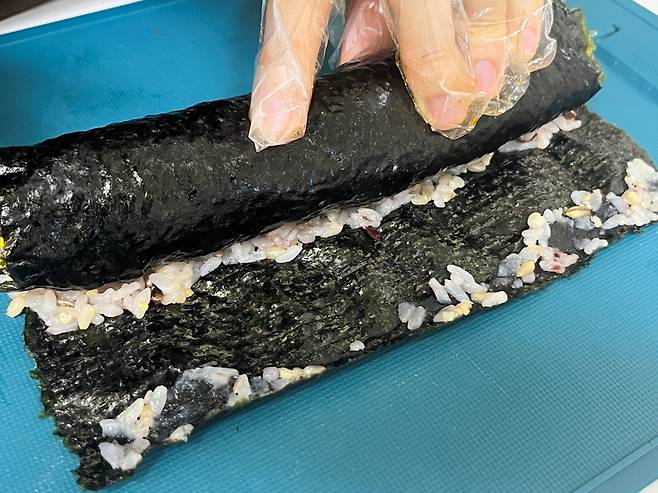 김밥 끝 부분이 밥이 끝나는 부분과 맞닿도록 해 주세요. 이렇게 해야 김밥이 짱짱하게 말립니다.