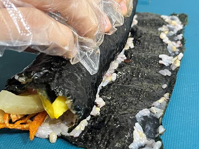 김 끝 부분에 밥풀을 묻혀 접착제 역할을 하도록 합니다. 이렇게 하면 김밥이 쉽게 풀리지 않아요.