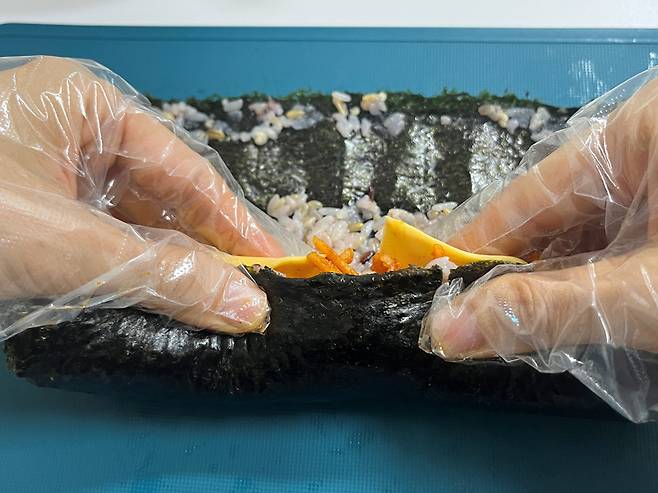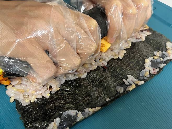 김밥을 쌀 때는 몸 쪽으로 당겨가며 짱짱하게 말아 주세요. 손으로 김밥 내용물을 안으로 말아 넣는다는 느낌으로 쌉니다.