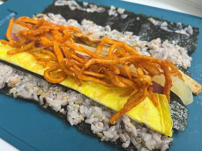 이렇게 김밥 재료를 올리기 전 김을 덧대면 김밥 재료가 튀어나오거나 터지는 것을 방지합니다.