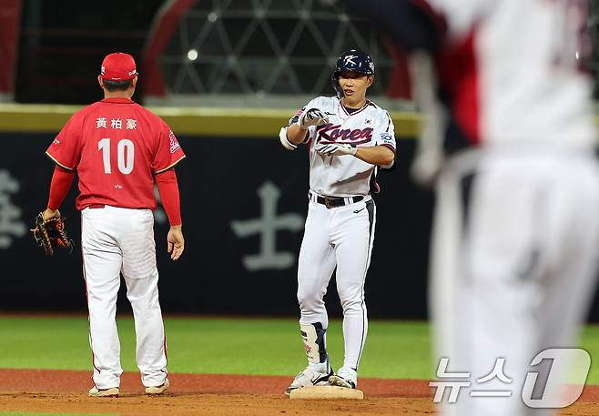 (타이베이(대만)=뉴스1) 장수영 기자 = 10일(현지시간) 오후 대만 타이베이시 톈무 야구장에서 열린 대한민국 야구 국가대표팀과 대만프로야구리그 웨이치안 드래곤스의 연습경기, 2회말 무사상황 송성문이 2루타로 출루한 뒤 아파트 세리머니를 하고 있다. 2024.11.10/뉴스1