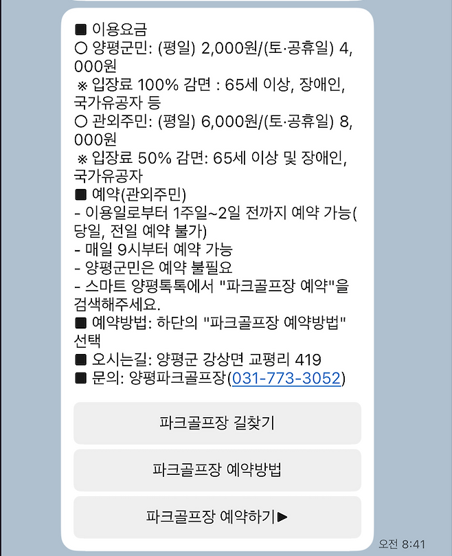 강상 코스는 체계적인 예약제를 운영하고 있습니다. 특히 타지역 이용객의 경우 사전 예약이 사실상 필수에 가깝습니다. 예약은 카카오톡 채널 ‘스마트 양평톡톡’을 통해 진행하며, 채널 입장 후 ‘파크골프장 예약’ 메뉴에서 날짜와 시간을 선택하면 됩니다. 주말과 공휴일은 예약 오픈 직후 마감되는 경우도 많아, 일정이 확정되었다면 가능한 한 빠르게 신청하는 것이 좋습니다.