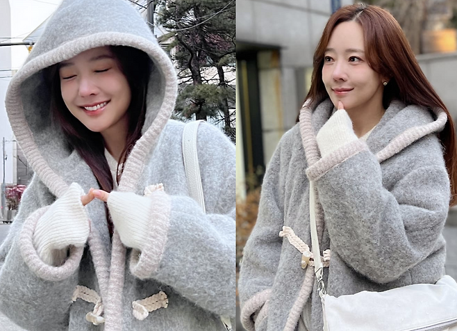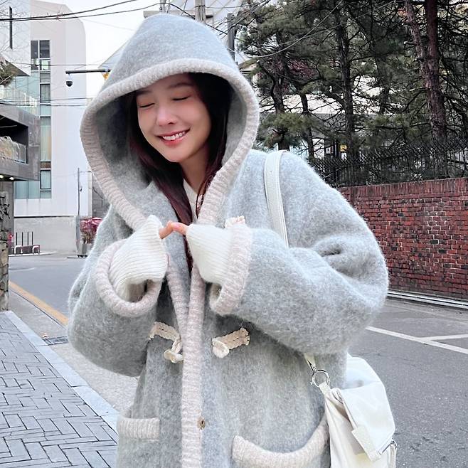 사진 속 소유진은 회색 떡볶이코트에 체크무늬 볼캡을 쓴 캐주얼한 패션을 선보였습니다.