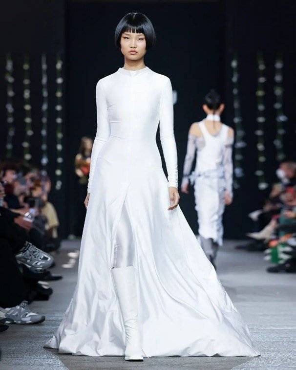은은하게 반짝거리는 새틴 소재와 타이트한 핏으로 여성스러움이 강조되었습니다. 약간 올라온 하이넥은 시크한 분위기를, 드레스 중앙의 긴 봉제 라인은 스포티한 느낌을 줍니다.