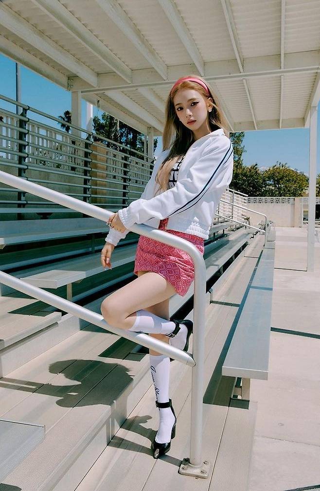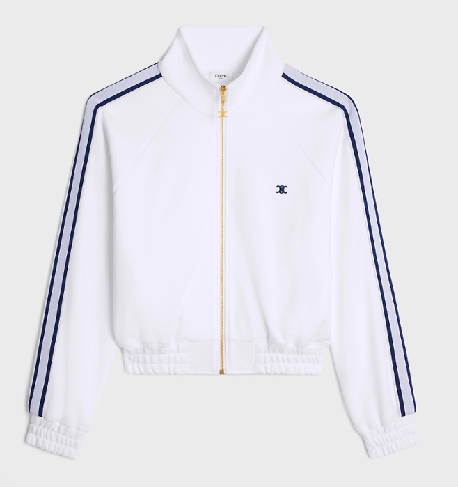 마치 교복 또는 팀복처럼 에스파 멤버 모두가 똑같은 트랙수트를 입었습니다. 화이트 베이스에 블루 계열의 더블라인 디테일로 비비드한 컬러와 스포티한 의상을 더욱 돋보이게 합니다. 셀린느(CELINE) 제품입니다.