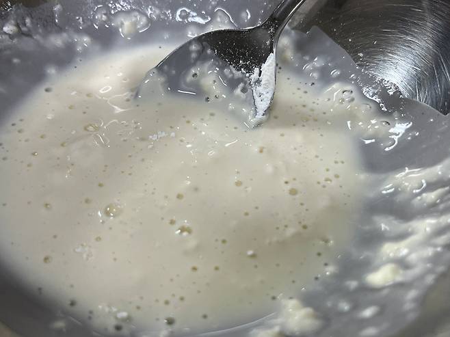 튀김 가루와 물을 약 1:0.8 비율로 썩습니다. 너무 곱게 섞을 필요는 없으니, 큰 가루 덩어리가 보이지 않을 정도로만 섞으세요.