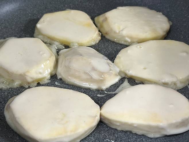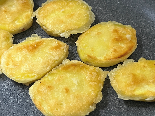 튀김옷은 얇게 흘러내릴 정도면 충분합니다. 튀김옷 입힌 고구마는 약불에 구워 주세요.