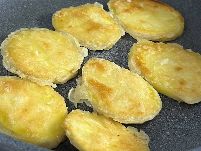 팬에 식용유를 두르고 고구마를 굽습니다. 고구마는 단단한 편이기 때문에 약불로 충분히 굽는 것이 좋습니다.