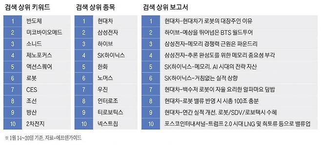 국내 투자자들의 '반도체 사랑'도 여전했다. 역대급 상승세를 보이는 현대차에는 못 미치더라도 삼성전자와 SK하이닉스 주가 역시 꾸준히 우상향하는 모습이다. 지난 한 주간 투자자들이 많이 검색한 키워드 1위는 여전히 '반도체'로, 6위에 자리한 '로봇'을 크게 앞섰다. 종목 검색 기준으로도 삼성전자(2위)와 SK하이닉스(4위)가 나란히 상위권을 지켰다.