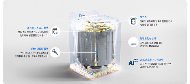 삼성의 최신 통돌이는 'AI'로 모든 설명이 가능합니다. 세탁 성능? AI가 세탁 모드부터 탈수까지 알아서 맞춰주고요. 에너지 절약? AI가 에너지 사용량을 최대 20%까지 줄여주고요. 소음과 진동? AI가 바닥의 단단한 정도를 감지해 통돌이의 균형을 수시로 잡아줍니다.