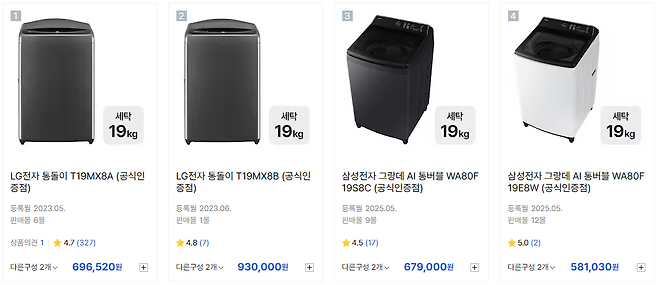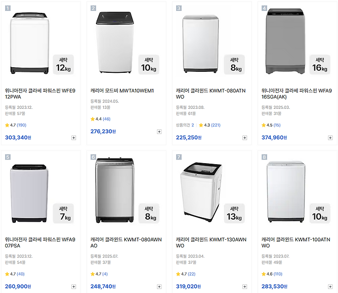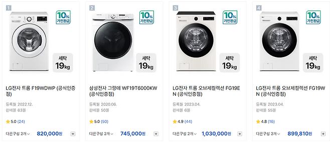 가성비를 따진다면 통돌이에 눈이 갈 수밖에 없습니다. 드럼 세탁기보다 전체적으로 가격대가 낮아 비슷한 용량을 기준으로 20만 원에서 많게는 80만 원까지 아낄 수 있습니다.