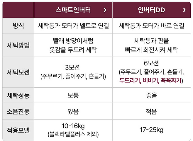 스마트인버터는 모터와 세탁통이 벨트로 연결되어 있어요. 일반 모터 대비 에너지 효율이 좋고 소음이 적지만 인버터DD 모터 보다는 여러모로 아쉬운 모습을 보여줍니다. 6모션과 같이 정교한 제어도 힘들어 저렴한 가성비 모델에 주로 탑재됩니다.