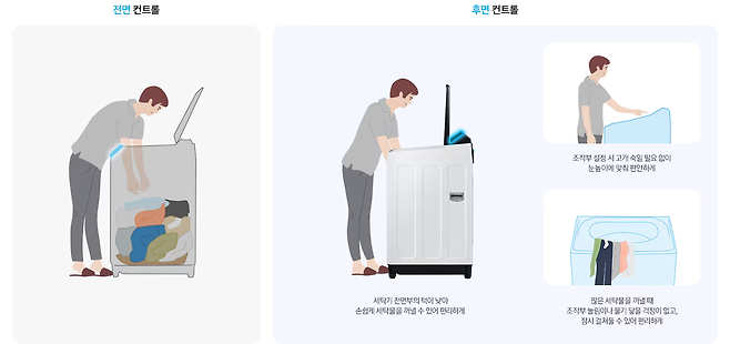 전면 컨트롤은 조작이 간편할지는 몰라도 세탁물을 넣고 뺄 때 물기가 닿을 위험이 높아요. 무거운 세탁물에 눌리는 경우도 잦은 편인데요. 이는 곧 조작부 고장으로 이어지게 됩니다.