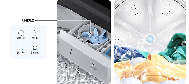 삼성 통돌이만의 또 하나의 핵심 기능은 '버블'입니다. 세제가 옷감에 닿기 전에 버블키트가 먼저 물과 세제, 공기를 잘 섞어 풍부한 버블을 만드는데요. 이 세탁 버블은 세제를 녹인 물 보다 약 2.5배 빠르게 옷감에 흡수된답니다. 에너지, 물, 세탁시간 전부 절약할 수 있죠.