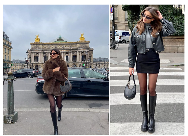 블랙 & 화이트 무스탕 또는 퍼 자켓에 니트와 숏 스커트 그리고 골드 주얼리, 화이트 핸드백 매치해 이쁜 부츠룩 완성★