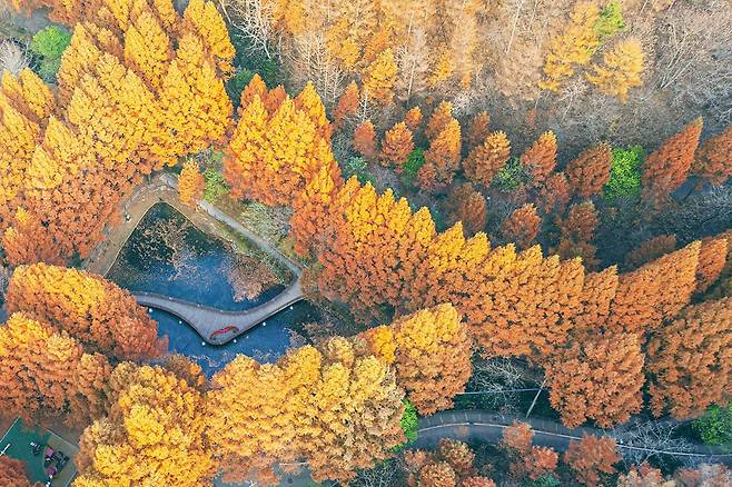 장태산 자연휴양림은 국내에서 유일하게 메타세쿼이아 숲을 품고 있는 휴양림입니다. 영화 속 한 장면처럼 우뚝 솟은 나무들이 빼곡하게 자리 잡고 있어, 걷기만 해도 마음이 차분해지는 느낌을 받을 수 있습니다.