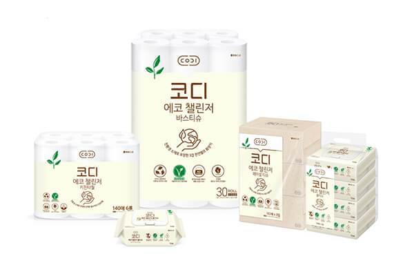 쌍용C&B는 100% 생분해가 가능한 소재를 적용한 비건 인증 제품 ‘코디 에코 챌린저’ 브랜드로도 물티슈를 공급하고 있다. 포장재에 100% 생분해성 소재를 사용해, 180일이면 자연으로 돌아가도록 제작됐다. 물티슈에는 76일 기준 생분해도 100% 원단을 사용했으며, 탄소 배출량 저감에 이바지하는 기술로 만든 제품에 부여되는 녹색 인증 포장재를 적용했다. 이탈리아 채식주의협회로부터 비건 인증 마크인 ‘브이라벨’을 획득한 제품이다. 70매 4팩 기준 판매가는 9,900원이다.