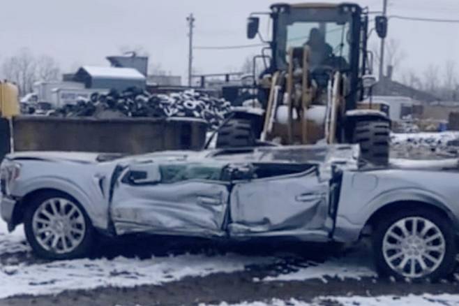 압축기에 들어가기 전 마지막으로 찍힌 차량의 사진을 보면 외관은 큰 문제 없이 말끔해 보인다. 커다란 범퍼와 각진 외관, 직선적인 헤드램프, 거대한 크기를 지낸 픽업트럭의 웅장한 모습을 드러내고 있다. 하지만 압축기 앞에서는 포드 트럭도 어쩔 수 없었다.