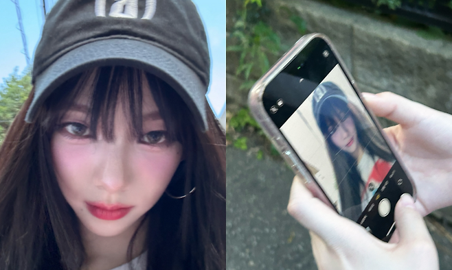 카리나는 긴생머리에 검은색 캡모자를 써서 내추럴하고 힙한 스타일을 추구했습니다.